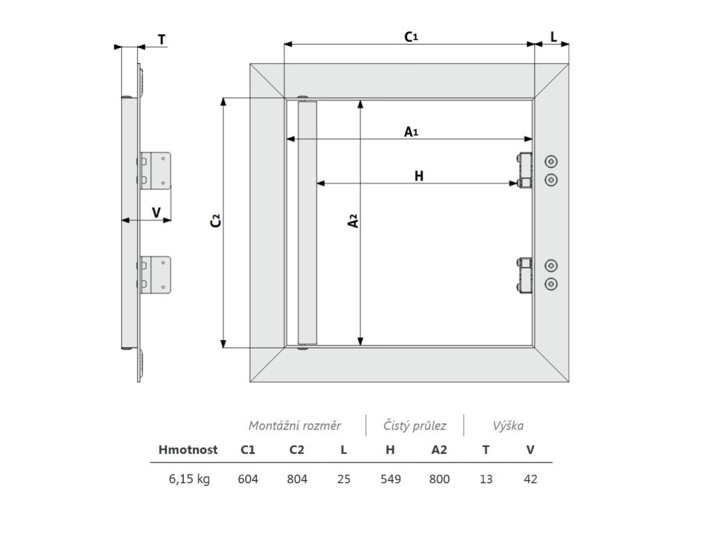 Hlavní nosná konstrukce dvířek a rám jsou vyrobeny z hliníkového profilu osazené sádrokartonovou deskou (GKBi - zelená) o síle 12,5 mm upevněnou do vnitřního rámu pomocí vysokopevnostního lepidla, což umožňuje rychlou a nenáročnou povrchovou úpravu. Dvířka jsou vyráběná ze speciálních hliníkových profilů, které jsou svařovány do venkovního a vnitřního rámu. Kompletní sestava je spojena pomocí pevného pantu a umožňuje tak otevření křídla dvířek v případě potřeby.