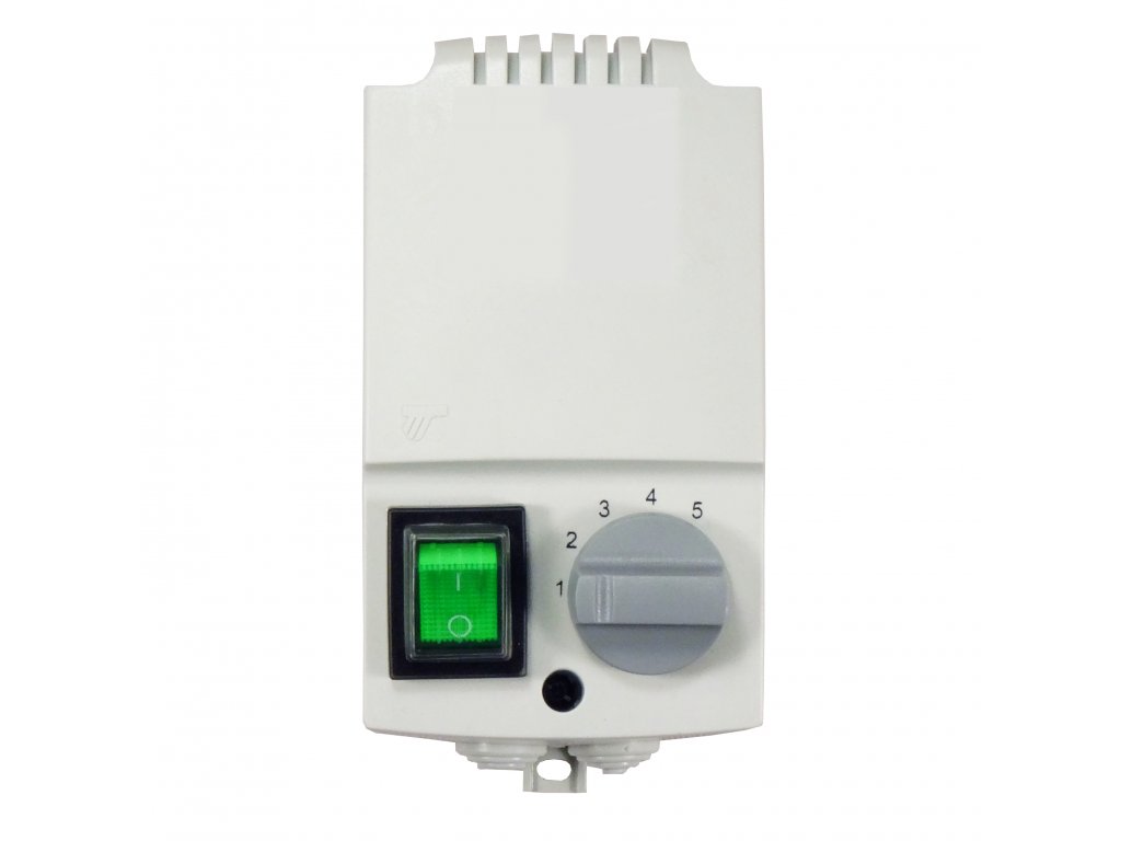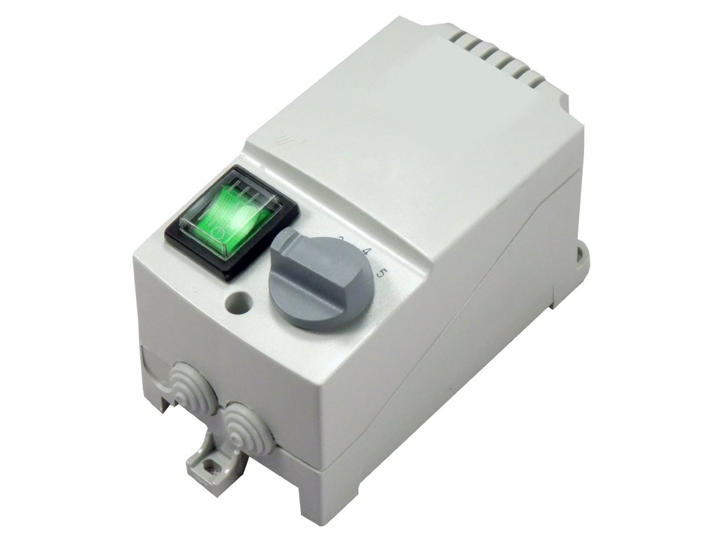 Jednofázový transformátorový regulátor otáček vhodný pro jednofázové motory ventilátorů řízených jmenovitým proudem 1,5 A. Svým využitím je předurčen pro montáž v průmyslových ventilačních systémech nebo topných zařízení. Regulátor otáček je vybaven pětistupňovou regulací pomocí kolečka, které je umístěno na předním panelu zařízení. Dále je vybaven samostatným tlačítkem pro světelnou signalizaci zapojení.