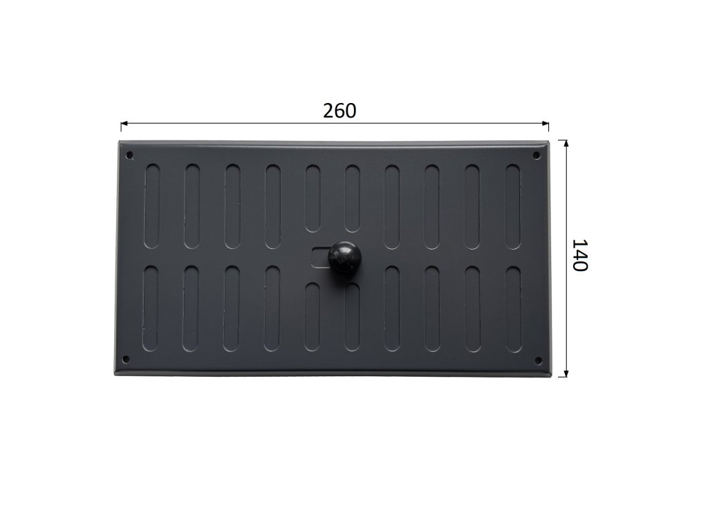 Ventilační mřížka s regulací MU 260x140 je vyrobena z pozinkovaného plechu o síle 0,8 mm opatřena ochranným antracitovým lakem RAL 7016. Vysekávané oválky o rozměru 60 mm x 7 mm jsou rovnoměrně rozloženy po celé ploše mřížky.