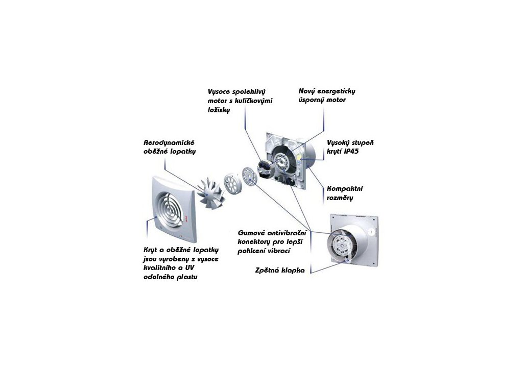 Ventilátor Vents 125 Quiet s unikátním designem a provedením, který zaručuje opravdu nízkou hladinu hluku při maximální odvětráváním až 185 m3/h. Kryt a oběžné kolo jsou vyrobeny z vysoce kvalitního a UV odolného plastu. Speciálně konstruovaný aerodynamický profil poskytuje vysokou kapacitu a nízkou hlučnost. Ventilátor je vybaven speciálně konstruovaným zpětným ventilem, aby se zabránilo zpětnému toku a tepelné ztrátě během pohotovosti ventilátoru.